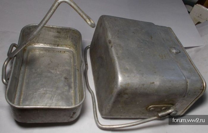 Это малый комплект. В полный комплект входила еще и фляга, которая вставлялась в котелок, а крышка крепилась снизу. А форма выполнена для удобства по форме тела человека.