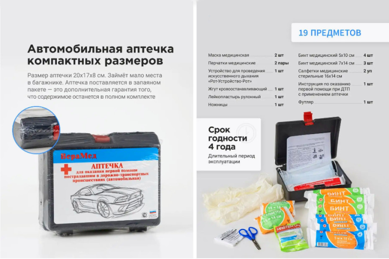 Автомобильная аптечка для оказания первой помощи пострадавшим в ДТПОсновные средства первой помощи за 2024 год в соответствии с рекомендациями Министерства Здравоохранения РФ в аптечный футляр входят 9 наименований предметов: