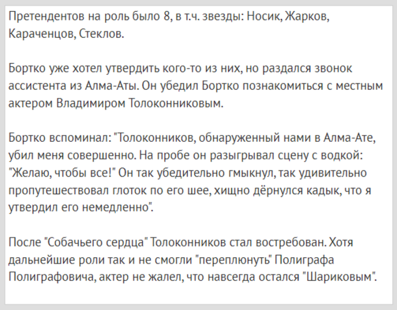 Владимир Бортко никак не мог найти актера на роль Шарикова, для своей экранизации Булгаковского «Собачьего сердца». Режиссер сказал ассистентам: «Найдите мне собаку!». Он хотел того, кто хоть немного бы походил на собаку.