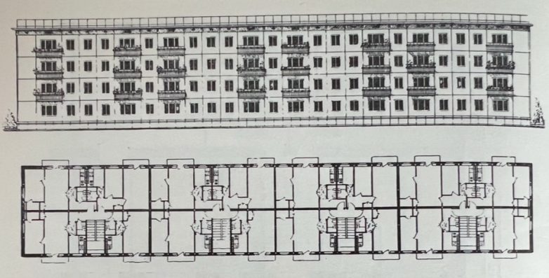 Эскиз дома (сверху) и план типового этажа. Из книги «9-й квартал в Новых Черёмушках. Опытно-показательное строительство жилого квартала в Москве (район Новые Черёмушки)» под ред. Б.Р. Рубаненко, 1959.