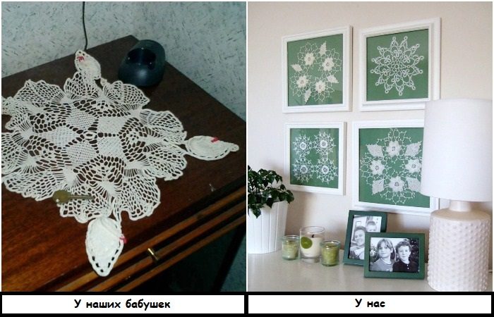 В советских квартирах вязаные салфетки встречались на каждом шагу. Ими украшали столы, телевизоры, спинки диванов и кресел. Однако сейчас этот предмет декора уже устарел, особенно если использовать его в большом количестве. Кружевные салфетки сами по себе яркие и акцентные, и если с ними переборщить, они очень сильно утяжелят обстановку. Поэтому есть два варианта: либо совсем избавьтесь от них, либо оставьте несколько экземпляров и органично впишите их в интерьер. Сейчас модно вставлять кружевные салфетки в рамки и делать а-ля картины, или пришивать их на наволочки, чтобы декоративные подушки выглядели более интересно.