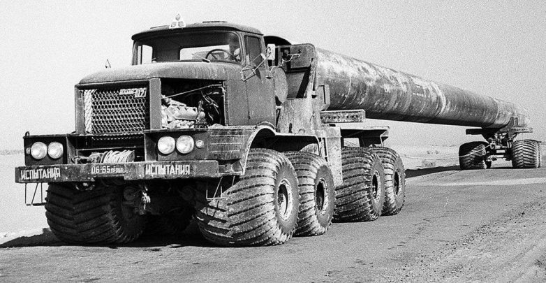 Грузовой автомобиль был выпущен в 1968 году для перевозки труб в экстремально непроходимой местности. Для этих целей была выбрана колесная формула 12х8, а повороты этот гигант совершал с изломом рамы, что упрощало ходовую и позволяло достигнуть радиуса поворота в 10,24 м, что недостижимо даже для новых конкурентов. Машину использовали на строительстве газопровода в Средней Азии и тогда же выяснилось – автопоезд способен проезжать барханы крутизной 16°! Увы, в серию она так и не вышла из-за слишком сложного изготовления и эксплуатации.
