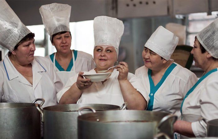 На первом фото по кругленьким личикам работниц сразу можно понять, что они общепитовские.