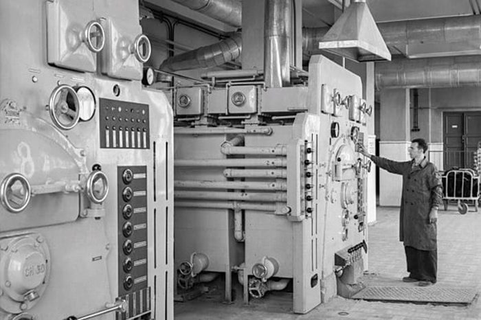 Один из цехов советской химчистки в конце пятидесятых годов прошлого века.