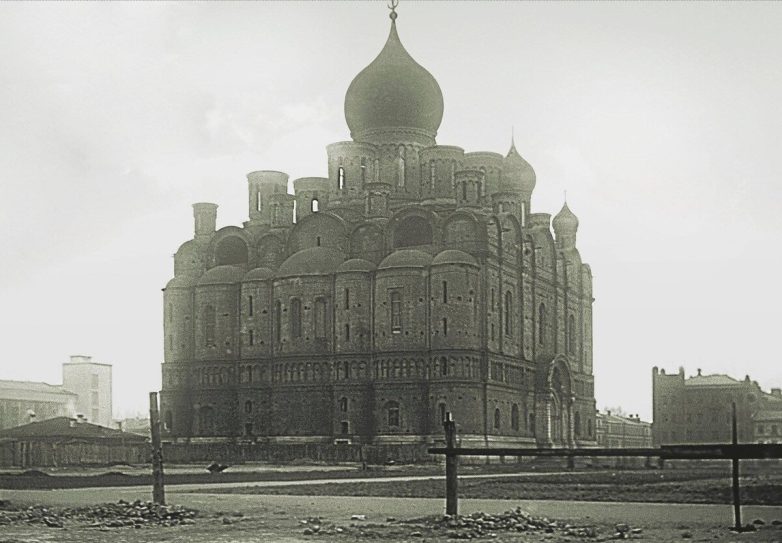 Что касается церковных сооружений Москвы, то снос большинства из них пришелся на первые годы после революции. Но был и один своего рода долгожитель – Александро-Невский собор на Миусской площади, второй по величине исторический храм Москвы после Храма Христа Спасителя. Строительство собора началось в 1913 году но было прервано революцией и так никогда и не возобновлено. Руководил работами видный русский зодчий Александр Померанцев, а одним из авторов проекта так и вовсе являлся Виктор Васнецов. Из 21 купола завершить успели лишь главный и одновременно самый крупный. Несмотря на приход к власти большевиков, в здании вплоть до 1920 года проводились богослужения, но после их запрета все ценности из собора были вывезены, а внутри разместился склад. Полузаброшенный собор стоял на Миусской площади до 1950-х годов, но в итоге все же был демонтирован, а на его месте появился Дворец пионеров Фрунзенского района Москвы и памятник писателю Александру Фадееву.