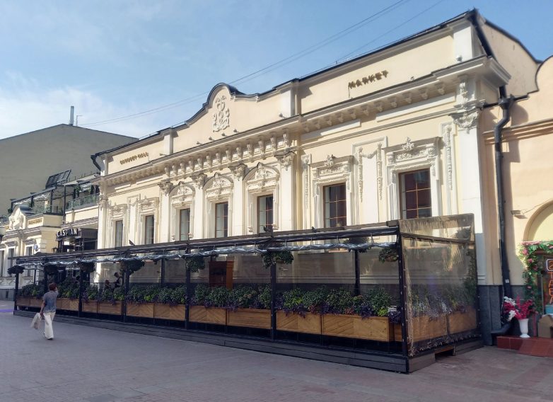 И в качестве завершения – фактурное и даже изящное здание с лепниной и полуколоннами, расположенное на Арбате, которое наверняка видели многие москвичи и гости столицы. Впрочем, большинство, скорее всего, даже не догадывалось о том, что данное здание представляет собой новодел. Это дом капитанши Хвощинской (№ 42), точнее то, что было построено вместо него. Современное здание появилось здесь в 1986 году и почти в точности повторяет облик оригинального строения, снесенного незадолго до того. Перестройка дома Хвощинской считается одним из первых примеров сноса исторического здания и строительства на его месте точной (ну, или почти точной) копии. Подобная практика широко распространилась по всему центру Москвы, начиная с 1990-х годов, но здесь хотя бы приложили максимум усилий для того, чтобы новое здание по крайней мере выглядело историческим. Вот только зачем было сносить оригинальное строение, все равно непонятно…