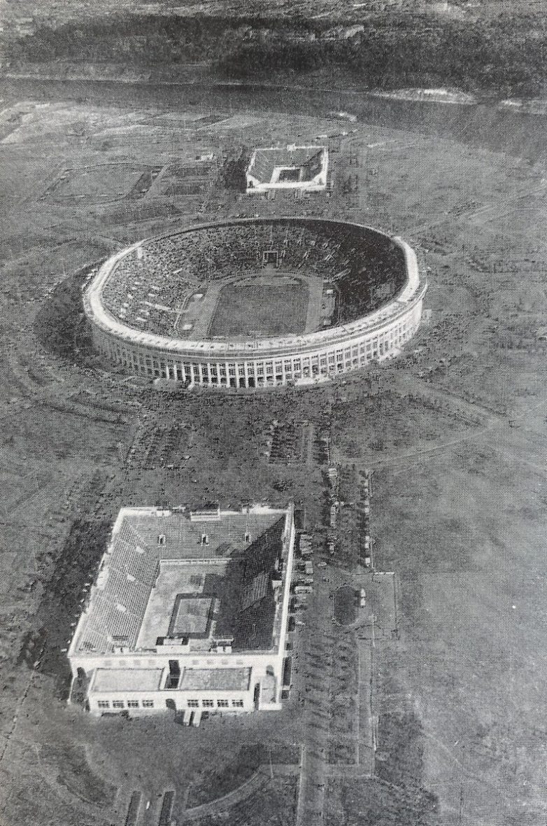 9. Так выглядел свежепостроенный стадион из главного здания МГУ на Воробьёвых (а тогда — Ленинских) горах.