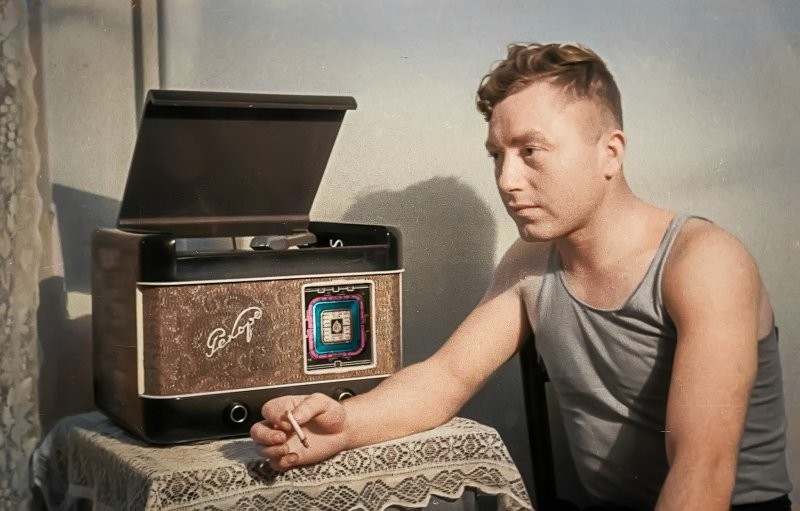 Мужчина слушает ламповую радиолу «Рекорд» с 1950 года выпускалась Бердским радиозаводом. Создана на базе модернизированного приёмника «Рекорд-47» и предназначена для приёма радиовещательных станций и прослушивания грамзаписи.