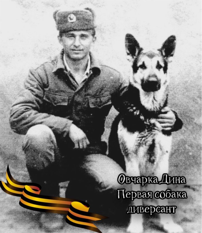 Первая собака диверсант.Участник «рельсовой войны» в Белоруссии. Дина выскакивала на рельсы перед приближающимся немецким воинским эшелоном, сбрасывала вьюк с зарядом и зубами выдергивала чеку капсюля-воспламенителя, после чего мчалась в лес. Успешно осуществила подрыв немецкого эшелона на перегоне Полоцк – Дрисса в августе 1943 года. В результате успешного выполнения боевой задачи было уничтожено 10 вагонов и выведена из строя большая часть железной дороги.