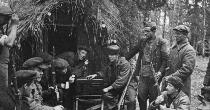 Партизаны слушают радио.