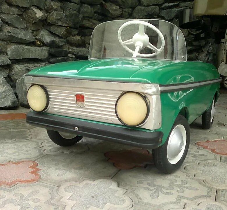 Это были машинки в разы меньшего размера, чем оригиналы и выпускал их завод АЗЛК, а продукция называлась Москвич. Такие машинки были предметом гордости и зависти среди детей и были далеко не у каждого. Машинка состояла из рамы и навешанных на нее штампованных деталей. Размер ее в длину 1100 мм, ширину 510 мм и масса 13 килограмм. Особым шиком были фары, которые горели по-настоящему и питались от батарейки в 4.5В.