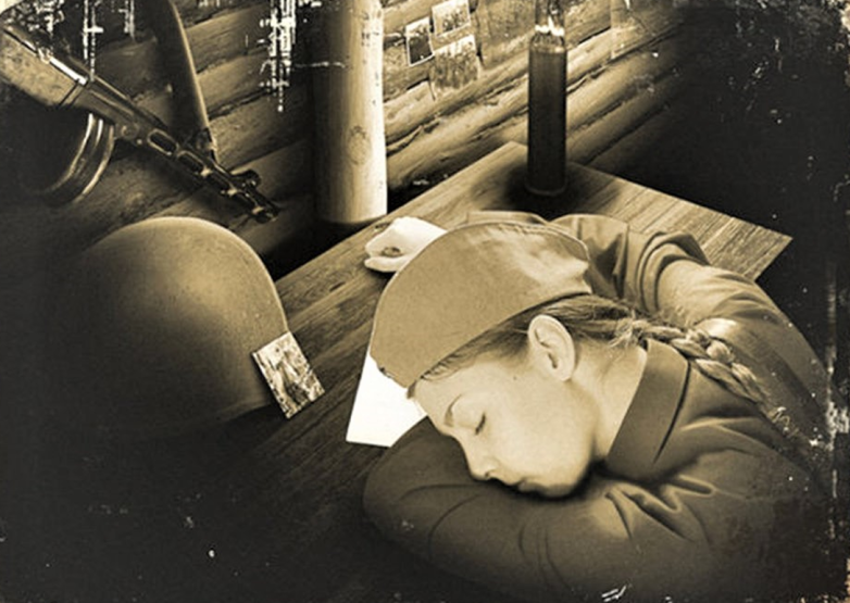 На этой фотографии спит молоденькая санинструктор. Отдыхает там, где придется. Урывками. Минутками. Просто скоро бой и надо идти на передовую спасать бойцов.