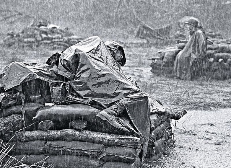 А это американцы. Им, конечно, пришлось хлебнуть поменьше, чем советскому солдату, но отдельным доставалось по полной. Спит под дождем, не обращая на непогоду никакого внимания.