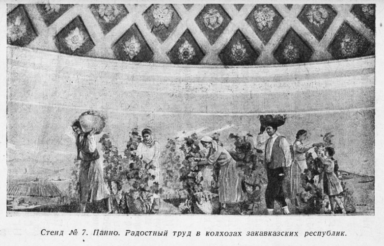 К сожалению, качественных фотографий того периода внутри павильона нет. Однако есть нечто похожее на них из официального путеводителя 1939 года. Там видно, что в отделке прибегали к огромному количеству лепнины, колонн и других рельефных украшений. Например, ромбовидных углублений (кессонов) в конструкции купола одного из демонстрационных залов. Также активно использовали невероятных размеров панно (во всю стену). На них изображали, как правило, процесс работы на виноградниках в разных уголках Советского Союза.