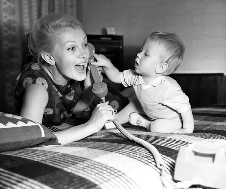 Очаровательная Валентина Титова с сыном Александром, который сейчас известный режиссер. Игры с детьми всегда увлекательны и радуют несказанно всех. Часто это выглядит очень забавно.