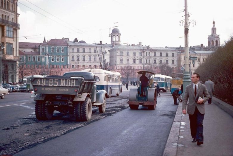 16. Посмотрим на площадь Свердлова (современную Театральную) и укладку свежего асфальта на ней.