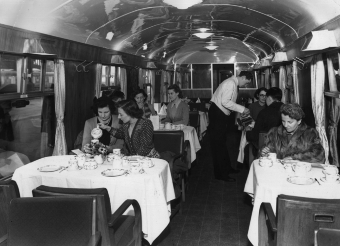 Стоит также отметить тот факт, что вагон был разбит на несколько зон: обеденный зал, кухня, служебные помещения для персонала и барные стойки, которые появились гораздо позже. Поскольку обеденные залы были главным элементом вагона-ресторана, то пространство в них было разбито на несколько зон со столами, рассчитанными на два-четыре человека. Столики были украшены белоснежными скатертями, а также сервированными посудой и столовыми приборами.