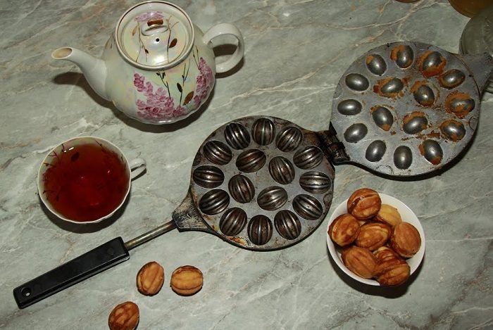 Внешне советская орешница напоминает две тяжелые металлические сковородки, соединенные между собой, с выемками для теста. Девайс нужно смазать растительным маслом, поставить на плиту, дождаться, пока он разогреется, затем заполнить формы тестом, закрыть и подождать некоторое время, пока печенье будет готово. Огонь должен быть небольшим, чтобы тесто хорошо пропеклось и не сгорело. Пользоваться такой штукой непросто, нужно приноровиться, однако вкус готовых орешков того стоит – они получаются прямо как в детстве.