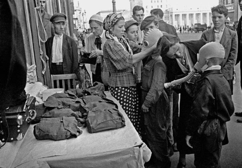 3. Раздача противогазов на площади Маяковского в Москве. 23 июня – 30 сентября 1941 года. Автор: Аркадий Шайхет.