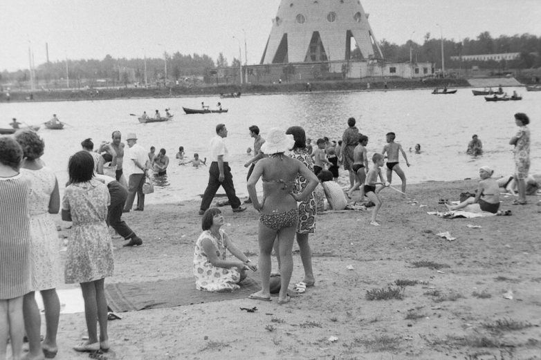 15. Останкинская телебашня ещё достраивается, а в Останкинском пруду по-прежнему купаются москвичи.
