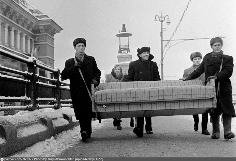 14. У Белорусского вокзала путешествует диван с сопровождающими.