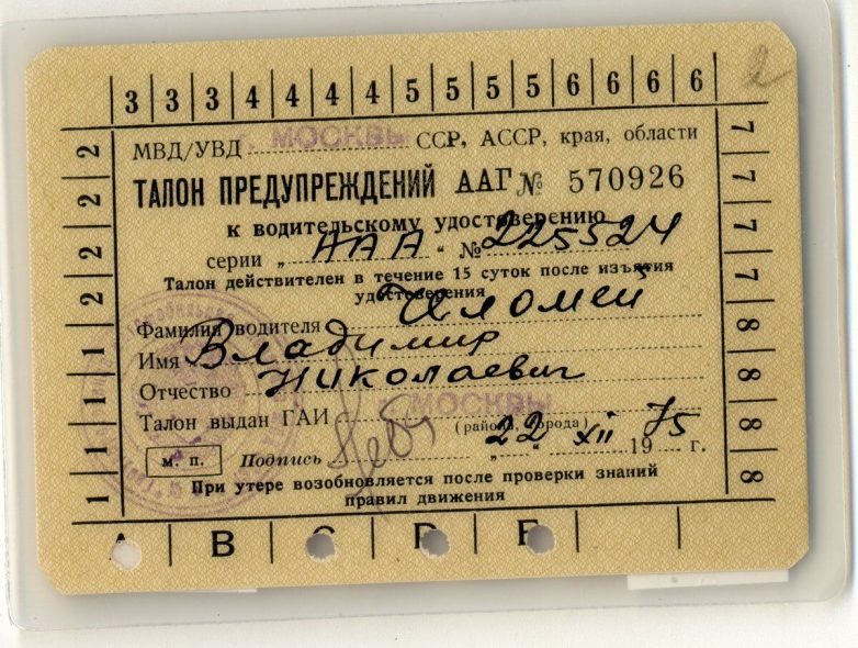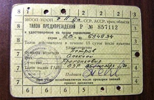Можно было лишиться удостоверения из-за спровоцированного по вашей вине ДТП, или например если заниматься частным извозом. Все это контролировалось и принимались различные меры. Но лишали и за более мелкие вещи. У каждого водителя в свое время был специальный талон, в котором сотрудники ГАИ ставили отметку (прокол) о нарушении. Если за год накапливалось 3 таких прокола, то водительское удостоверение изымалось. Была в то время и система штрафов за нарушения ПДД, но о них мы поговорим в следующий раз.