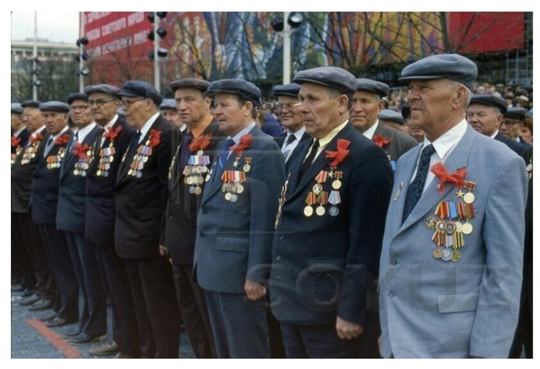 Строй не старых ещё ветеранов. Так и было в 70-е годы, сам видел. Их было много и это были крепкие ещё мужики, правда среди них встречались и однорукие и безногие…