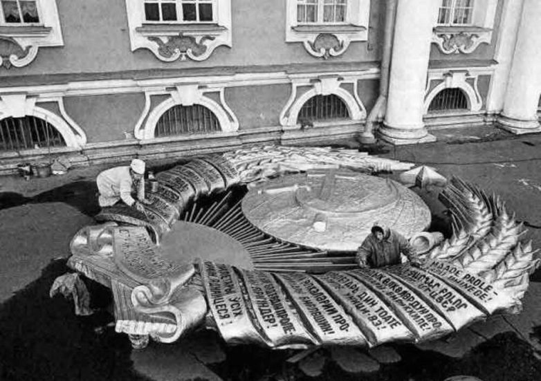 14. Около Зимнего дворца наводят красоту на гербе Советского Союза.