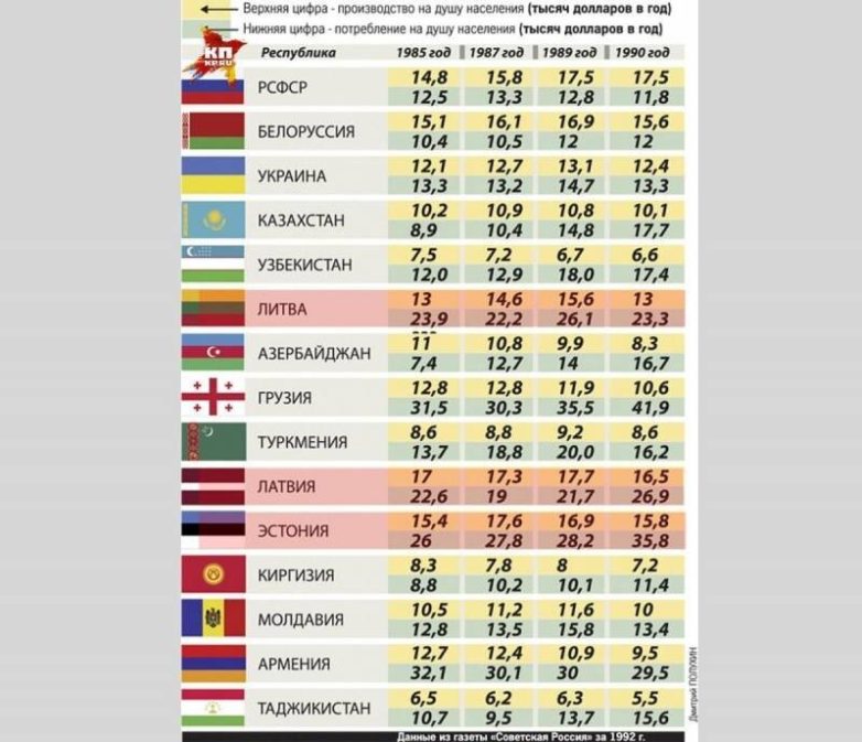 Далеко не однозначная статья. Очень приблизительно описаны республики тогда. В списке нет неоднозначной Украины. Много рабочих мест, большие предприятия, много «теневой экономики». Причем интересные срезы по территориям. Камень преткновения Крым. Ещё одна здравница с санаториями, домами отдыха не меньше знаменитые чем черноморские берега.опять же интересный срез военные, гражданские. Забыта Грузия с ее экономикой. Молдавия. Везде было разное снабжение что может объяснятся наличием представителей наверху. Неоднозначные описания и реалий много, что замешано на политике. Также Прибалтика ранее была знаменита радиоэлектроникой, автомобилестроением и где оно теперь. Также Абхазия условно была поделена на сельское хозяйство и туризм сейчас особо не заметно ни сельского хозяйства ни туризма.