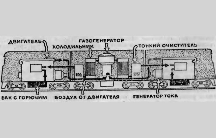 Например, газогенераторный локомотив. Внешне его было сильно отличались от обычного поезда, а внутри всё было ещё интереснее: он возил с собой дрова, а топливо производил сам по дороге к месту назначения.