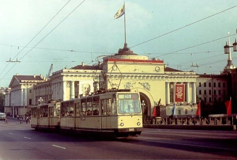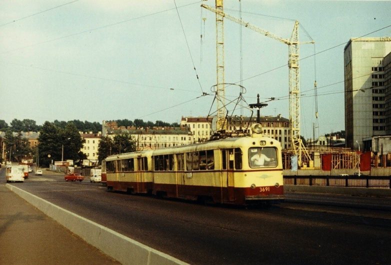 9. Трамвай 6 маршрута на мосту Свободы (так тогда назывался Сампсониевский мост). На заднем плане строится концертный зал гостиницы «Ленинград».