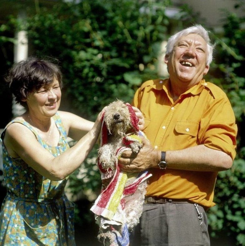 19. Юрий Никулин с женой Татьяной искупали любимую собаку. Фото 1983 г.