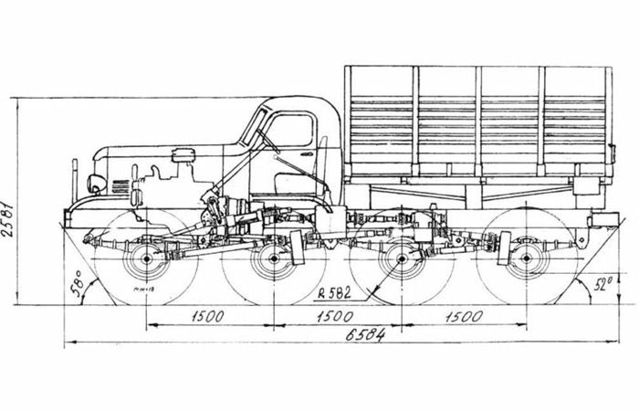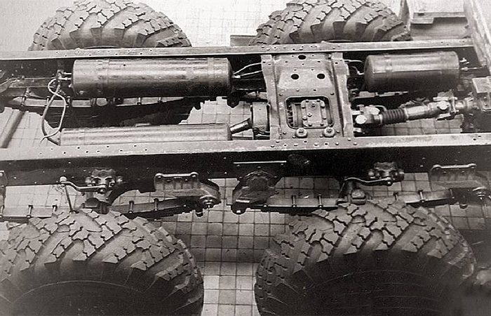 Самое же интересное скрывалось внутри. У машины не было рамы в привычном понимании, вместо нее имелся несущий цельнометаллический корпус, как у танка. Подвеска же сама по себе была шедевром. Каждое колесо крепилось на независимом торсионе с ходом около 300 миллиметров, поэтому машина не ехала по ухабам, а плавно перетекала через них. Все колеса постоянно сохраняли контакт с землей, что давало отличное сцепление с любой поверхностью. Сердцем монстра стали два бензиновых двигателя ЗИЛ-375, выдававших в сумме около 360 лошадей, но хитрость была не в мощности, а в схеме работы. Каждый двигатель работал на свою сторону — левый на первые и третьи колеса, правый на вторые и четвертые. Это создавало уникальную, абсолютно симметричную полноприводную схему. Если один мотор выходил из строя, второй спокойно продолжал везти машину к цели.