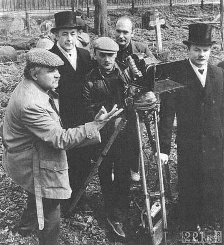Игорь Масленников, Василий Ливанов, оператор Юрий Векслер, директор картины Игорь Визгин и Виталий Соломин на съемочной площадке «Шерлока Холмса».
