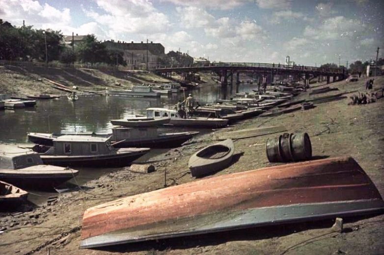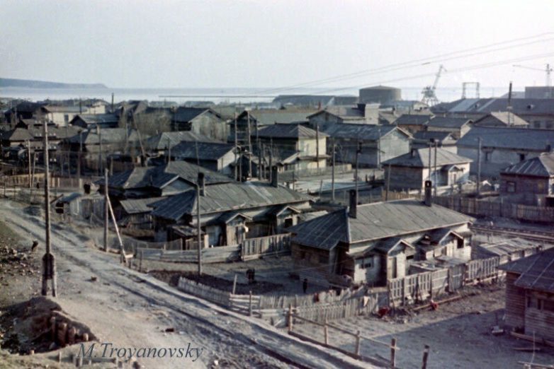 А я в эти годы жил в Воркуте и в памяти моей снег, сугробы и угольные ящики вдоль наших бараков. 9. Новое поколение москвичей наверное не знает, что в те годы централизованного отопления во всех домах еще не было, было много котельных, а в старых домах в каждой квартире печи для отопления и плиты для приготовления пищи. Дрова для плит и печей хранились в дровяных сараях, которые рядами тянулись по московским переулкам. Вот на фоне таких сараев и сфотографировали девчушку с котенком. 19. Город Тоёхара (ныне Южно-Сахалинск) расположен вдали, километрах в сорока, от моря. Так что на фото не Ю.Сахалинск, возможно Корсаков.