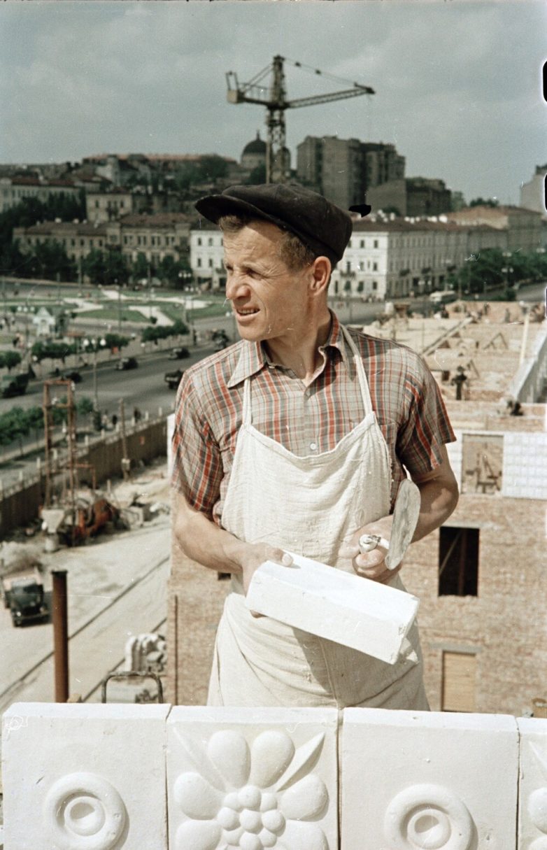 31. Киев. Продолжается послевоенное восстановление Крещатика. На фото — каменщик Федор Иванович Кравчук.