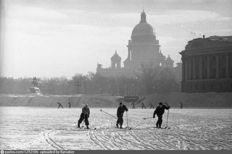 8. Переносимся в Ленинград. Катание на лыжах по Неве на фоне Исаакиевского собора.