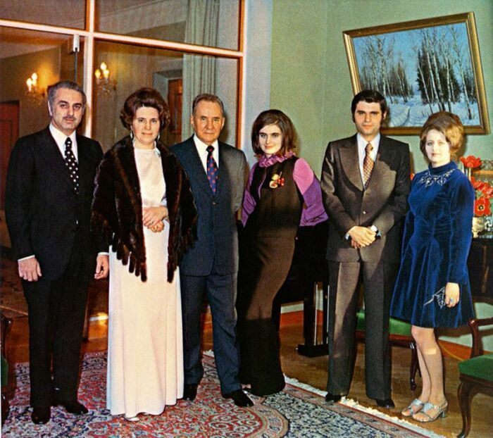 Семья А.Н. Косыгина. Слева направо: Джермен Михайлович и Людмила Алексеевна Гвишиани, Алексей Николаевич Косыгин, Татьяна Джерменовна Гвишиани и Алексей Джерменович Гвишиани с женой Наталией Борисовной Гвишиани