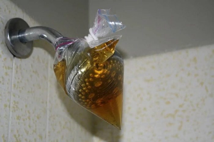 Если вы заметили, что напор в душевой лейке ослабел и она стала хуже пропускать воду, значит, забились отверстия. Самый эффективный способ вернуть лейке работоспособность – замочить ее в растворе уксуса. Смешайте его с водой в пропорции 1:1, налейте в пакет и зафиксируйте на душевой насадке с помощью веревки или резинки. Оставьте состав на пару часов, чтобы он подействовал, а затем снимите пакет и пройдитесь по отверстиям старой зубной щеткой. В конце промойте лейку в миске с чистой водой, чтобы убрать остатки уксуса и налета. И вот напор воды снова такой, как и должен быть!