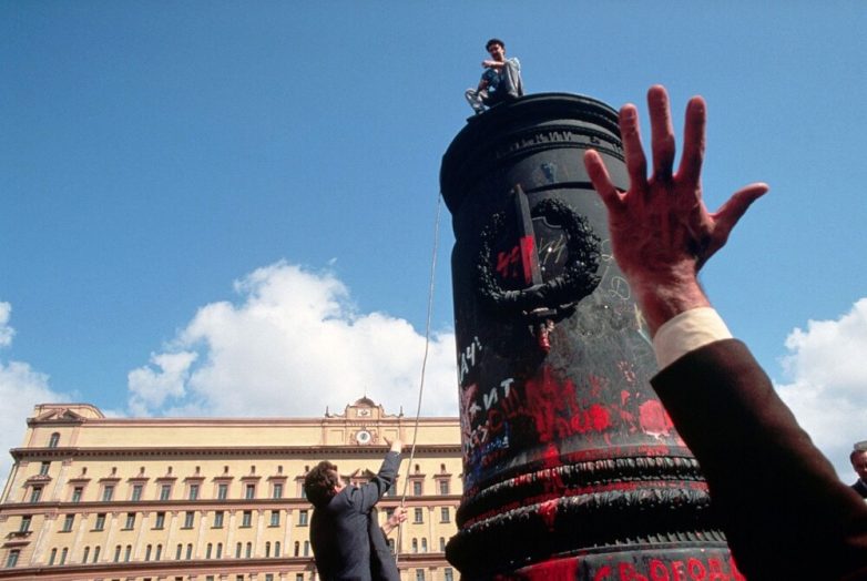 14. У постамента снесенного памятника Феликсу Дзержинскому. А случился снос в ночь с 22 на 23 августа 1991 года.