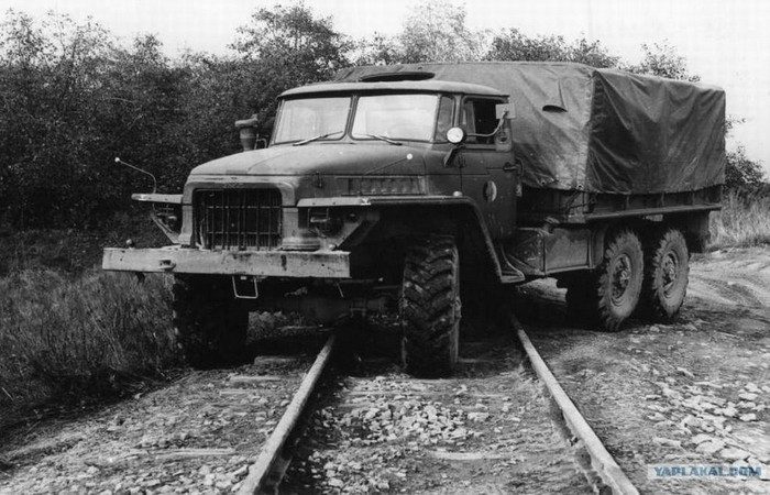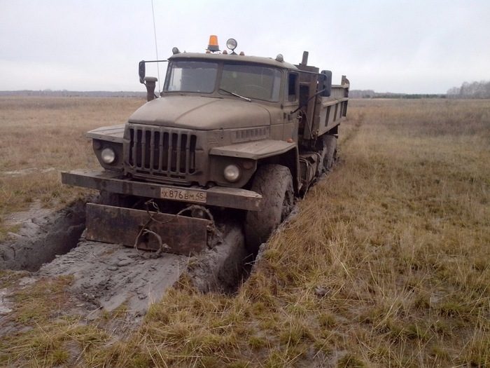 "… застрять на Урал-375 было непросто, но если машина всё-таки где-то «садилась» или увязала, то вытаскивать ей чаще всего приходилось с помощью какого-нибудь гусеничного тягача." На этом «Урале» лебедка самовытаскивателя (так она и называлась в паспорте машины) располагалась сзади, под кузовом и мы, работая на кабельных трассах в Амурской области, возили с собой метров 200-300 дополнительного троса и всегда выползали сами из любых болот размотав этот росс и зацепившись за ближайшее дерево.
