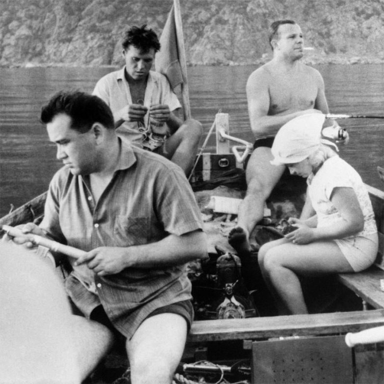 На переднем плане слева – председатель Чехословацкого союза молодежи Мирослав Завадил (позже – посол Чехословакии в СССР), за ним – матрос, который помогал управлять лодкой, справа на переднем плане – Александра Пахмутова и Юрий Гагарин. Фото из архива Рахмана Везирова.