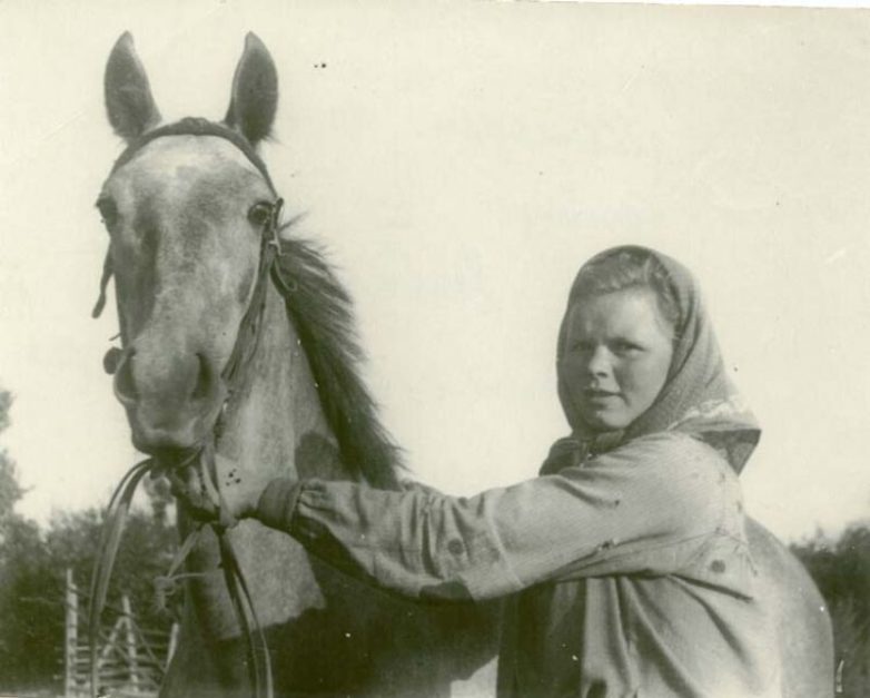 20. Молодой конюх колхоза «Красный шекснинец» Заботкина с племенной лошадью. 1954 год. Автор: Г. Ефимовский.