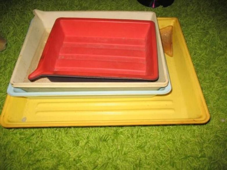 были и поглубже и покрупнее. Я чтобы не путать сбоку написал на них красной краской «П» и «Ф» — всё ж как ни мой их потом, а путать их не советовали, следы реактивов остаются на стенках. А у тёти моей были металлические эмалированные! Это когда я ещё мал был и конечно сам не фотографировал — почти все мои детские фото делала моя тётя, фотоаппаратом «ФЭД» и сама же она печатала.