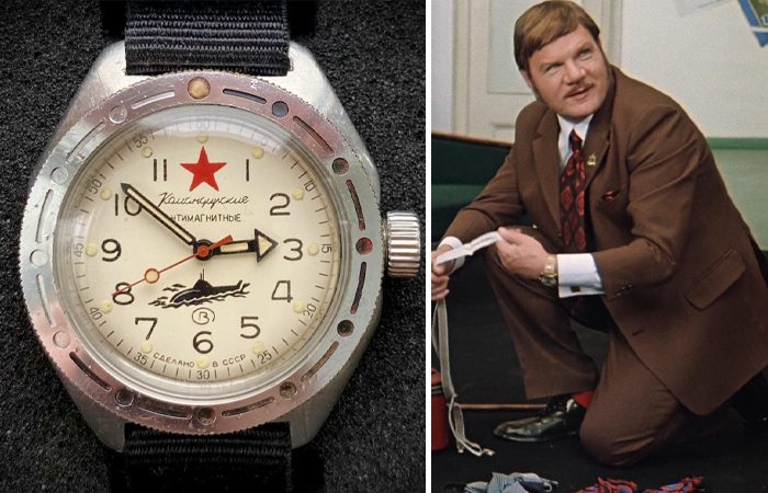 Пожалуй, самыми легендарными часами времен Советского Союза стали марки «Командирские». Их выпускал завод «Восток». Аксессуар был изготовлен специально на заказ по приказу Минобороны СССР. Они шли в качестве награды для офицеров за их заслуги. Часы отличались от остальных советских аксессуаров наличием пыле- и влагозащищенного корпуса, повышенной прочностью и арретира. Также стрелки были покрыты люминесцентными метками и был календарь. Их было сложно достать, поэтому часы стали символом гордости, престижа и статуса. Они стали настоящей легендой СССР.