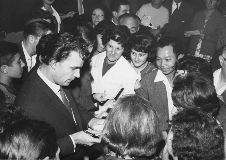8. Евгений Урбанский раздает автографы после премьеры фильма Григория Чухрая «Чистое небо», Париж, 1962 год.