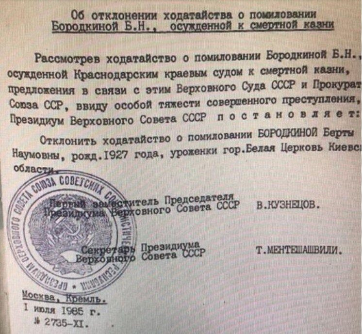 Бородкина была приговорена к смертной казни, ходатайство о помиловании было отклонено.