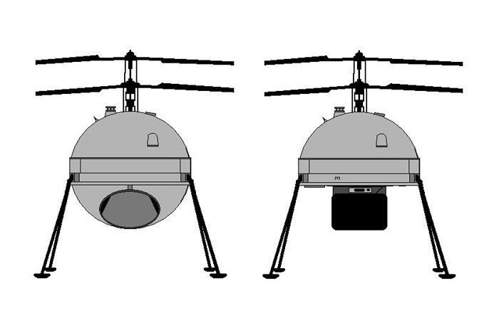 Согласно некоторым источникам, изначально беспилотник собирались адаптировать для полётов в самых неудобных условиях, например, в лесу, где полёту мешают многочисленные ветки. Для защиты несущих винтов их должны были одеть в специальный проволочный каркас, который не должен был пускать в рабочую зону посторонние предметы. По всей видимости, от этой идеи отказались и не стали надевать на винты защитный каркас. Тем не менее главная особенность беспилотника, его сферическая форма, осталась на месте. Фактически это был шар на ножках, а все агрегаты и полезная нагрузка помещались внутри корпуса: для дополнительного оборудования предусмотрели грузовой отсек в нижней части шара. При этом у беспилотного летательного аппарата не было таких понятий как передняя или задняя часть, он мог лететь в любую сторону и вращаться вокруг своей оси, что делало его очень маневренным.