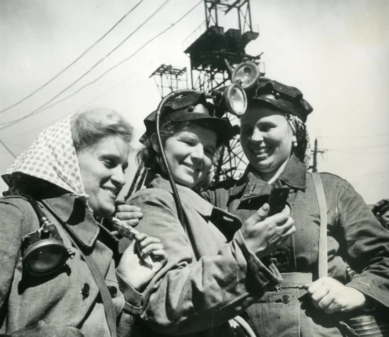 23. Мотористки Ф.Н. Казакова, В.В. Лазарева и Е.С. Харитонова перед спуском в шахту.