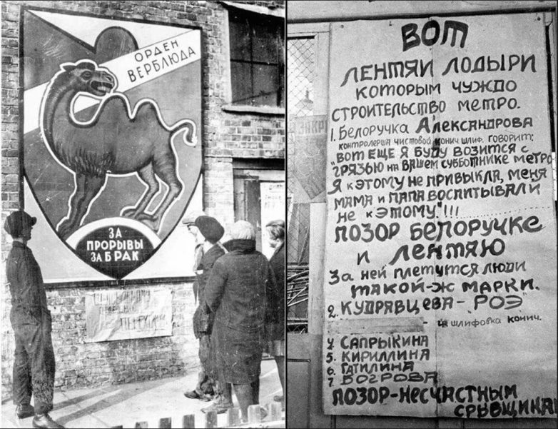 Вот например, доска позора комсомольцев на подмосковном заводе СССР в городе Электросталь, раскрывает фамилии и проступки, творчески обыгрывая Родину-мать и объясняя как это помогает родному городу.